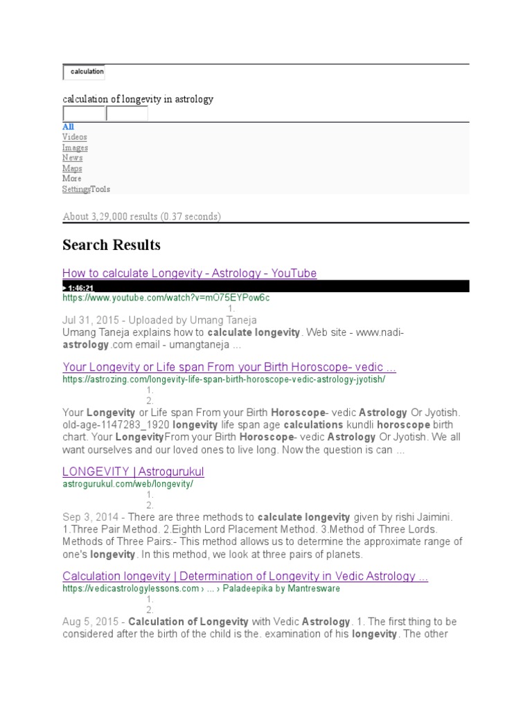Calculation longevity | Determination of Longevity in Vedic Astrology ... Calculation of Longevity with Vedic Astrology 1. The first thing to be considered after the birth of the child is the examination of his longevity. The other effects should be judged later. If the nativity indicates some merits like Raja Yoga etc., their effects should be assessed