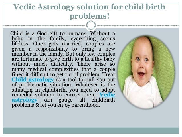 Vedic Astrology Predictions Related to Childbirth For vedic astrology childbirth predictions through Vedic Astrology the first, fifth as well as the ninth houses or their horoscope lords are religiously analyzed. The Ascendant, Navamsa and Saptamsa divisional charts are analyzed and both fifth and ninth houses are observed for the childbirth to predict the timing of conceiving a woman. Get Child & Baby Astrology Forecast Report Online | 🥇 Askganesha Astrology on Child birth with Life Report. This full life report would not only give you the predictions related to Child birth but also would give you the answers to other aspects of life such as married life, career, finance, travel, harmony, health, etc. You will also get to know the best suited gemstones and also other effective remedies to ...