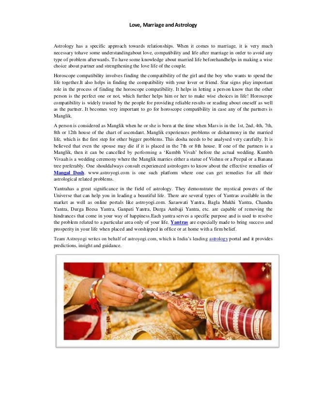 › astrology › marriageMarriage Astrology | Love Marriage or Arranged Marriage ... The Marriage Calculator is meant for giving you a broad outline of the nature of your marriage and married life on the basis of the planetary position in your birth chart. As per Vedic astrology, there are several factors that influence the timing of a person’s marriage and chart the course of the married life.
