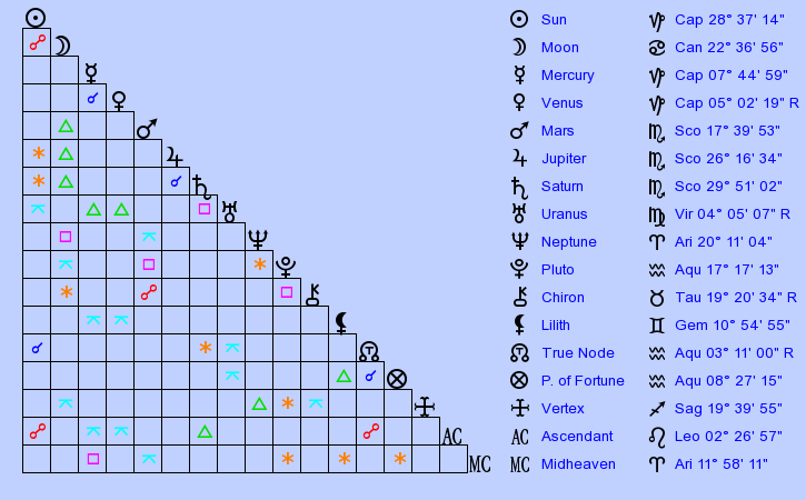 Western Astrology | Birth Chart Calculator | Natal Wheel Chart ... This software will prepare a wheel graphic based western astrology natal chart, providing you an interpretation of your personality and positioning of Sun, Moon and planets. You will be able to get a fair idea of your personality and influence of planet combinations on your approach and life. Free Instant Western Astrology Birth Charts Generator! - Mystic Scripts The birth-chart or natal-chart is essentially a calculated mathematical representation of the planetary positions at the precise time of ones birth. Heres how it is designed. The exact time, date, week, month and year are noted and then calculated on the basis of the ascendants direction - eastern horizon. Ascendant and Descendant, MC and IC in ... - Astrology Oct 30, 2020 · The MC-IC axis divides the chart into the Western and Eastern hemispheres. The ascendant is the Eastern part of the natal chart. This area of the natal chart symbolizes you as an individual and it’s linked with the self. The descendant part of the horoscope is about you working together with other people around you. Astrology and natal chart of Elizabeth II, born on 1926/04/21 - Astrotheme In brief, a natal chart is composed of ten planets: two luminaries, the Sun and the Moon, three fast-moving or individual planets, Mercury, Venus and Mars, two slow-moving planets, Jupiter and Saturn, and three very slow-moving planets, Uranus, Neptune and Pluto.