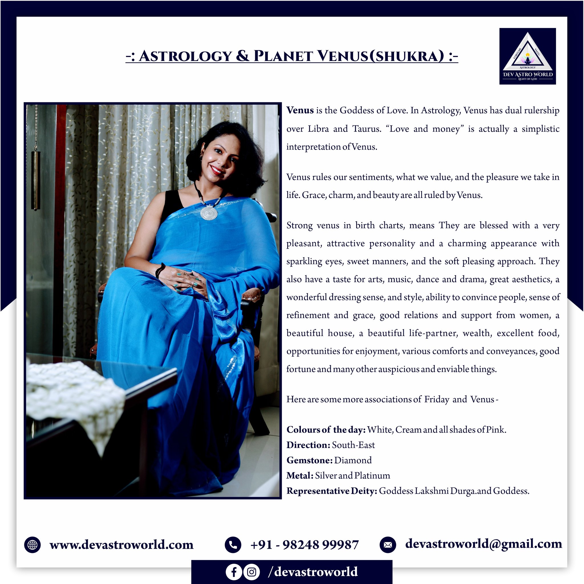 favorites of Venus, Shukra Lucky metal, color, direction ... - Astrology Favorite Deity of Venus - Goddess Laxmi, The Goddess Laxmi is the divine giver of colors in personal life through the planet. Favorite Direction of Venus -Southeast, The planer rules in the southeast direction. Favorite Metal of Venus - Silver, The metal Silver is the possessor of celestial shimmer like Venus.