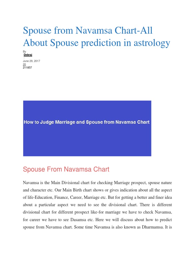 How To Read Navamsa Chart In Vedic Astrology (D9 Chart) Mar 26, 2020 · The spouse will have anger issues but the spouse will be bold, courageous, brave with lots of energy. The spouse will love to play sports or do activities that involves physical activities, the spouse may also have an interest in cooking. Venus: Venus in the 7th house of Navamsa Chart makes the spouse will have a very loving and caring ...