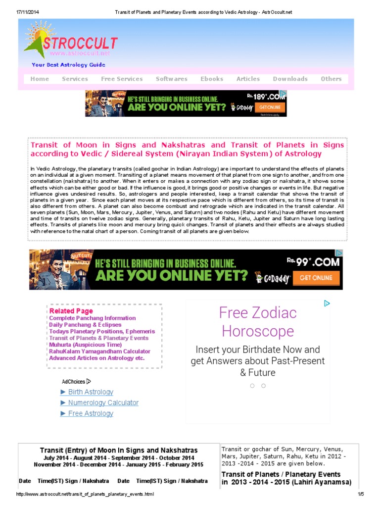 Astroyogi: Free Astrology Predictions by Expert Astrologers Indian Astrology: Indian astrology (Vedic astrology) can be traced back centuries and is based on the movement of the different stars and planets. It also incorporated astrology signs dates, or zodiacs later to be more encompassing. This stream of astrology studies 27 constellations, 9 planets, 12 zodiacs, and 12 houses and their impact on people’s lives. Astrology by date of … Transit Chart Calculator, Astrology Transits online - Astro-Seek.com Astrology transits online Planets and other objects are in continuous motion. The aspects they create with the planets in our natal birth chart are called transits. Transits can help us to understand the situation in which we find ourselves in. Optional graphic styles: Modern or Traditional style; Aspect lines (Tr->Natal or Natal only) Optional transit calculators: Natal … Vedic Astrology Prediction, Horoscope, Rashifal - Clickastro Horoscope solutions Online-Clickastro the #1 Astrology service provider with more than 100 million users gives you Vedic astrology guidelines and horoscope solutions to all concerns of life. Get free horoscope in 30 seconds. Navamsa/ D 9 Chart Prediction Analysis In Vedic Astrology Sep 15, 2019 · Talk To Astrologer. Our Apps On Google Play Store. Enroll Online Astrology Course. Exalted Planet in Navamsa Or D-9 Chart: If a planet (whether it is Sun, Moon, Mars, Jupiter, Saturn, Mercury, Venus) is in the exalted sign in Navamsa chart then that planet becomes strong enough to give a good result, even if it is debilitated in Rashi chart.