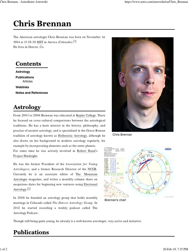 Chris Brennan is creating The Astrology Podcast | Patreon An invitation to attend the live recording of the monthly astrology forecast episode. These forecasts are usually recorded around the third or fourth week of each month, using a live webinar format where the audience watches and participates in a chat room through Zoom. See all 6 levels About Chris Brennan