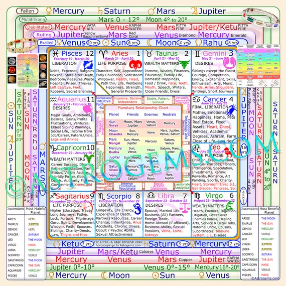Wealth chart vedic astrology. Wealth in Astrology - Thevedichoroscope.com you need to look into divisional charts as well and as per my experience best chart to check wealth is laabh mandook hora chart, where planets in the first hora (0 to 15) degrees remains in same zodiac and planet in 2nd hora (15 to 30) goes to eleventh zodiac from its placement in the main chart for example your jupiter is in aries at 9 degrees … Wealth Astrology - Indications of wealth in birth chart - Clickastro Jupiter and Venus are the indicators of wealth and prosperity in Vedic Astrology. Jupiter, the biggest planet, is also the most beneficial planet. It represents growth, expansion and gaining of wisdom. It enhances your abilities and luck and generally makes everything better in life. Venus represents beauty, passion and comfort in life. Free Wealth Astrology | Astrology wealth and prosperity, Free Health ... Wealth astrology. Wealth is a very important aspect of human life. The presence of wealth brings happiness and maintains peace in a family. But at present India is such a country which is still in developing stage and people are facing problems like illiteracy, unemployment which hampers one's wealth factor a lot. Inflation is also an added ... Money & Wealth Giving Planets in Astrology - VEDIC RAJ ASTROLOGY Pinpointing the planets who are signifying 2nd & 11th houses in astrological chart for money & wealth :-. Step 1> Find out the planets who are placed in 2nd & 11th houses. Step 2 > If no planets are placed in 2nd & 11th houses then find out the planets who are the sign lords of 2nd & 11th houses. Step 3> After finding the planets of step 1 & 2 ...