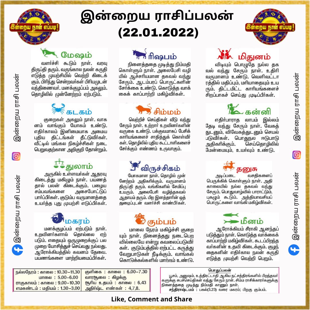 20.09.22 செவ்வாய்க்கிழமை - Today RasiPalan | Indraya Rasi ... Sep 19, 2022 · 20.09.22 செவ்வாய்க்கிழமை - Today RasiPalan | Indraya Rasi Palan | September - 20 | இன்றைய ராசிபலன் ... Tamil monthly Calendar 2022 | Monthly Tamil Calendar 2022 and … Tamil Monthly Calendar of December 2022 with Monthly Rasi palan against Each Rasi. Tamil monthly Page Calendar with panchangam | calendar.tamildot.com Displays the English calendar dates along with following Hindu religious information Daily Nalla neram ( Good Time ) in tamil calendar; Daily Panchangam information in tamil calendar Jathagam and horoscope birth chart in Tamil (ஜாதகம்) Your date of birth astrology in Tamil consists of rasi kattam or chart, navamsa kattam, astrology signs, dasa puthi, thosa kanippu, rasi palan, nakshatra palan and lagna palangal in Tamil language. A Jathagam is an astrology chart or diagram specifying the angular positions of the nine grahas (planets) at the exact time of a person's birth.