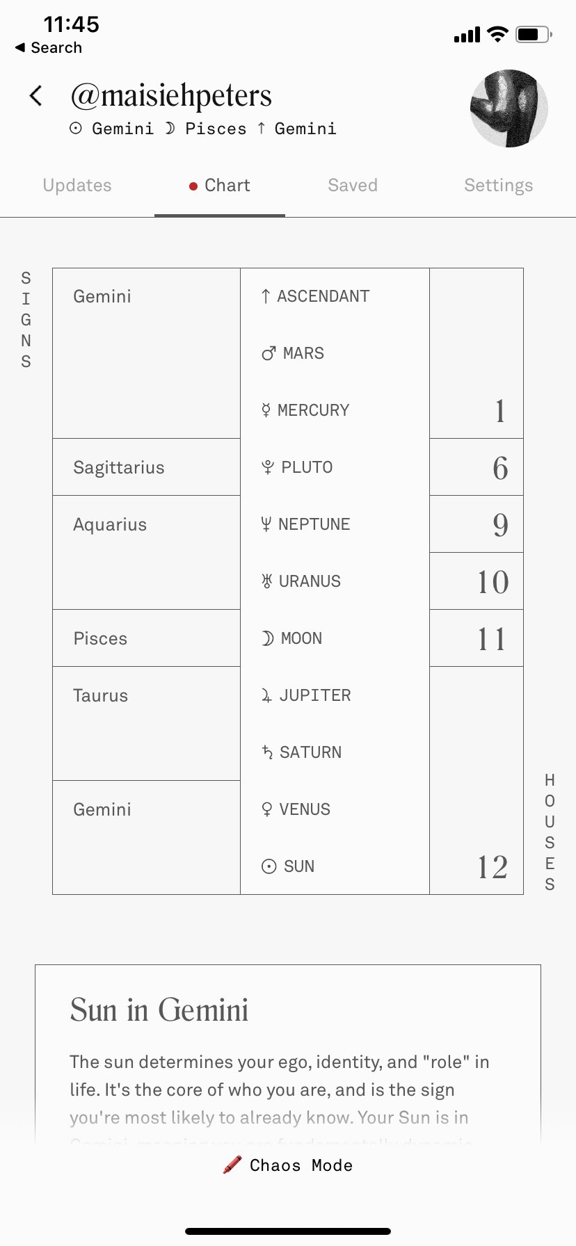Birth chart chaos astrology. › mercury-retrograde › astrologyMercury Retrograde Effects by Zodiac Sign - Horoscope.com The planet Mercury rules both quick-witted Gemini and practical Virgo, so right off the bat, we know these two sun signs will be heavily affected.It also matters in which sign and in which of the houses of your birth chart the retrograde cycle lands in. EOF Understanding a birth chart in astrology and how to read one Each house in your chart — ranging from First (Ascendant) to Seventh (Descendant) to 10 th (Midheaven) and reaching completion at 12 — is ruled by a zodiac sign. That is why you have all ... Gigi Hadid and Bella Hadid's birth charts reveal their destiny Gigi Hadid's birth chart shows her ambition—and irresistible allure. Gigi Hadid was born on April 23, 1995. This makes her an enduring Taurus Sun with a freedom-loving Aquarius Moon. Her birth ...