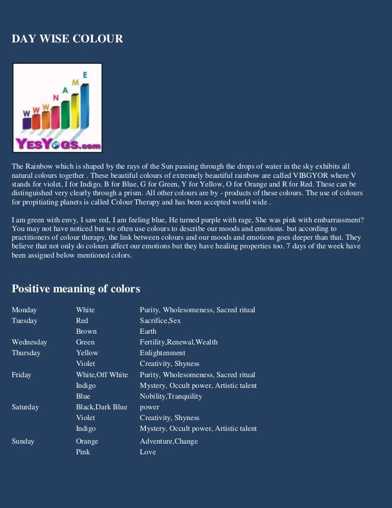 Lucky Colour, Today Lucky Colours, My Lucky Colours - Astropedia The colors of Tuesday are Red and Brown. While the former can be said to denote sacrifice and sex, the latter represents earth. Green is the color for Wednesday, which denotes fertility, wealth and prosperity. Thursday's colors are Yellow and Violet. While Yellow indicates enlightenment, Violet stands for creativity and also shyness.