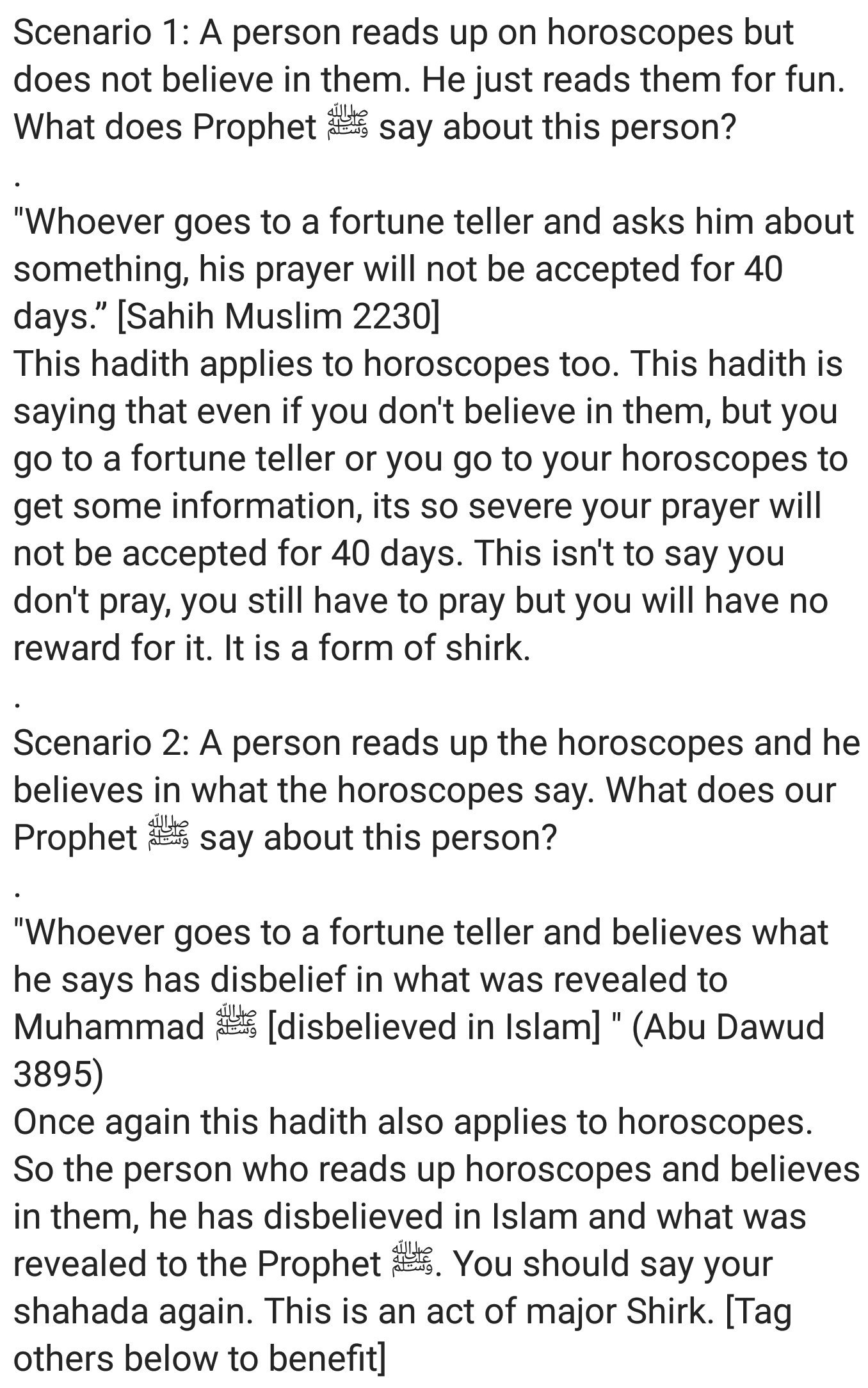 What does Islam say about Horoscopes? Is it true to believe in their ... The Answer Dear Brother / Sister, Horoscopes were prohibited because people believed in their effects and eventually this it harmed their belief in fate. However, it is unobjectionable to say "I am this sign or that sign", just as stating a date of birth. Nevertheless, it is wrong to believe in their effects.