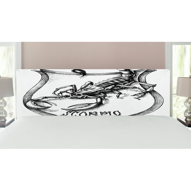 Astrology Headboard, Black and White Heraldry Zodiac Scorpio Image Graphic with Claws Stars Design, Upholstered Decorative Metal Bed Headboard with ...